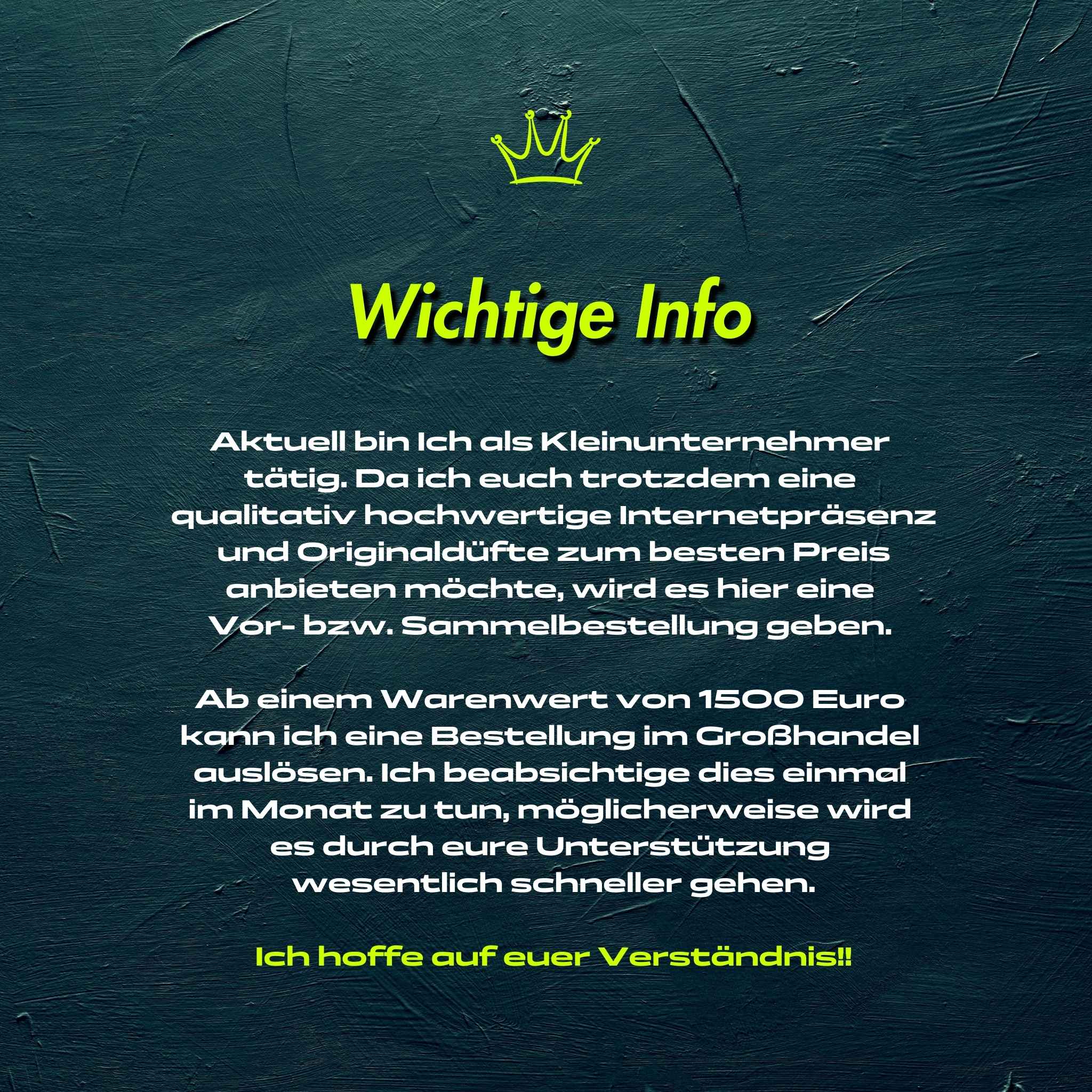 Aktuell sind wir als Kleinunternehmer tätig, sodass Bestellungen erst ab einem Sammelbestellwert von 1500 Euro ausgelöst werden können, damit keine hohen Lager- sowie Personalkosten anfallen können und wir euch die Produkte trotzdem zu den bestmöglichen Konditionen anbieten wollen.